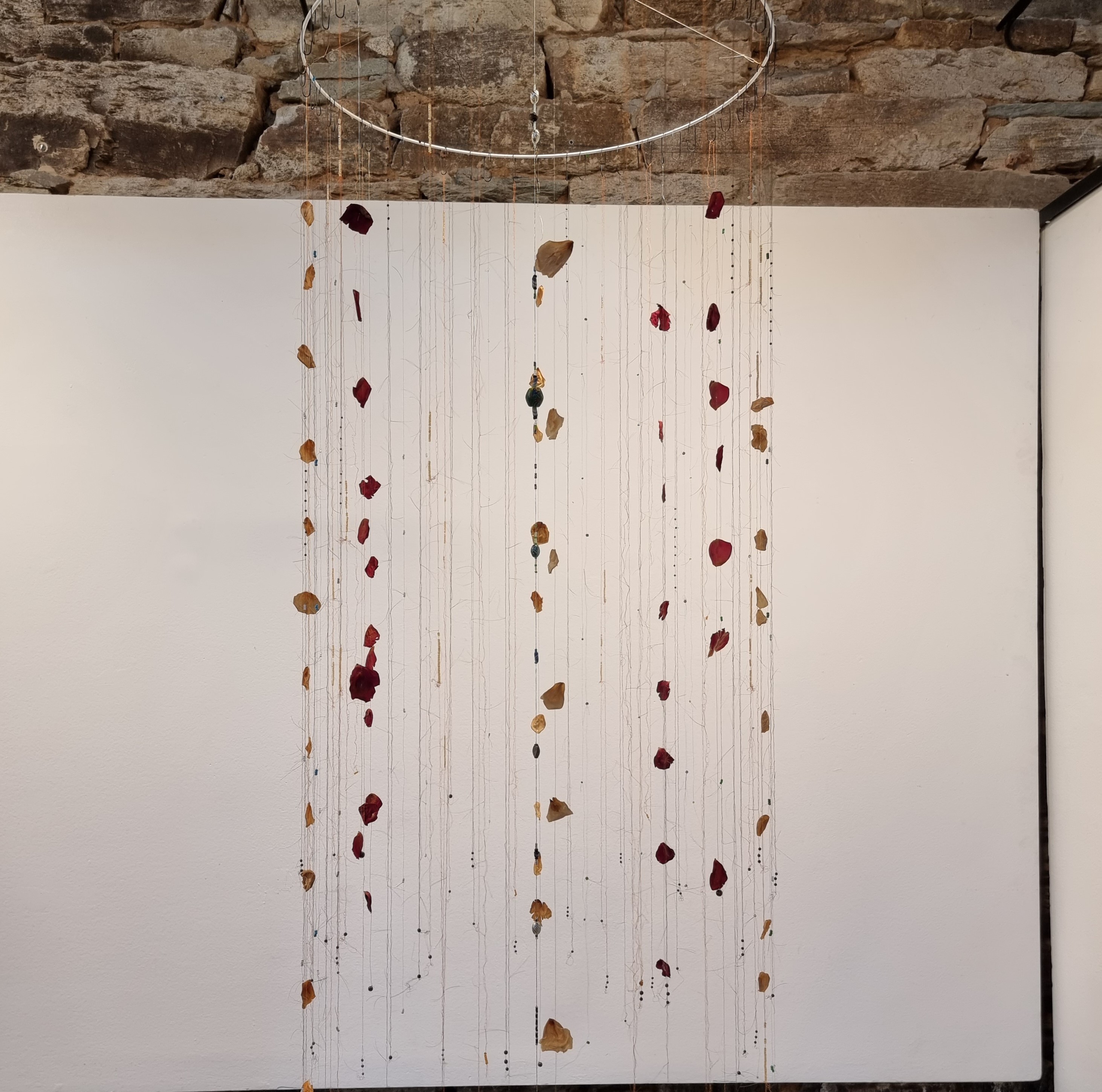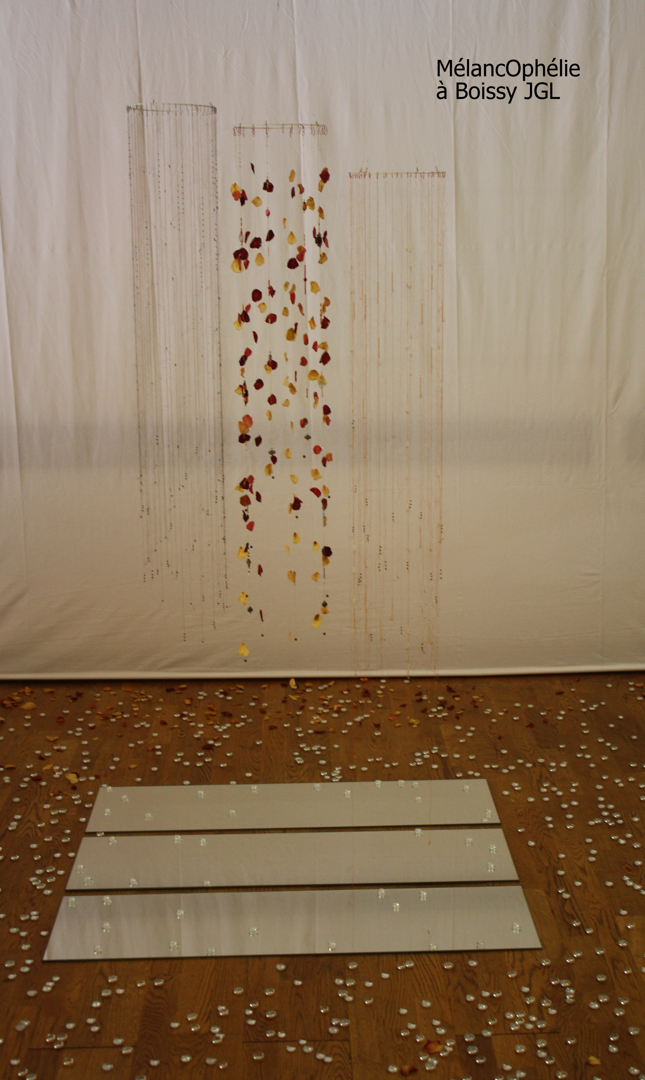 Œuvre composée de trikhotages de cheveux, plombs, perles de verre et pétales de roses suspendus au dessus de trois miroirs. Entourés de demies billes de verre et pétales de roses.